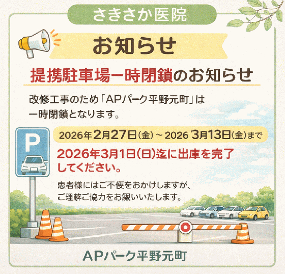 当院が提携している2つのコインパーキングのうち、JR平野駅の南側ロータリーにございます「NTT-APパーク平野元町」が下記の期間、工事のため閉鎖します。